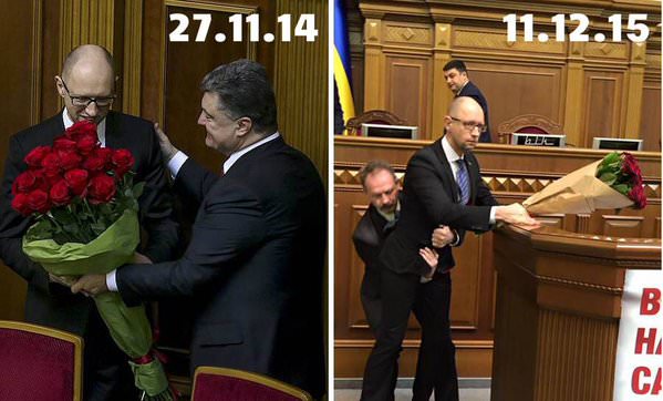 Депутат рады Олег Барн подарил Арсению Яценюку букет роз, перевязанный траурной лентой, и вынес главу кабинета министров с трибуны. Далее в парламенте завязалась потасовка.