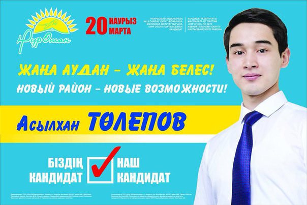 «В этом году 25 лет со дня обретения независимости Казахстаном. С каждым годом республика растет и развивается. Я считаю, что молодежь страны является движущей силой. (...) Молодежное крыло алматинского филиала «Нұр Отан» выступает за благополучие каждого человека, за оплату труда и благополучие горожан», - заявлял в своей программной речи актер Толепов.