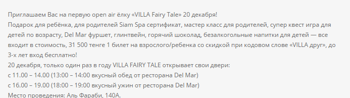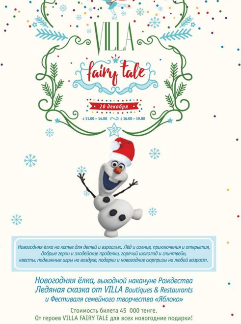 1. VILLA Fairy Tale предлагает детям и родителям посетить «первую open air елку», которая пройдет 20 декабря. Цена мероприятия - 45 тысяч тенге с человека. Также организаторы уточняют, что стоимость билета понизится до 31 500 тенге, если при входе произнести кодовое слово «VILLA друг», а детям до трех лет позволен и вовсе бесплатный вход.