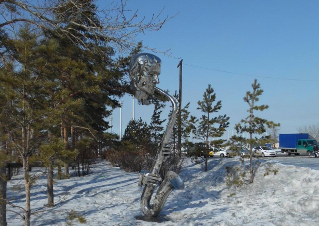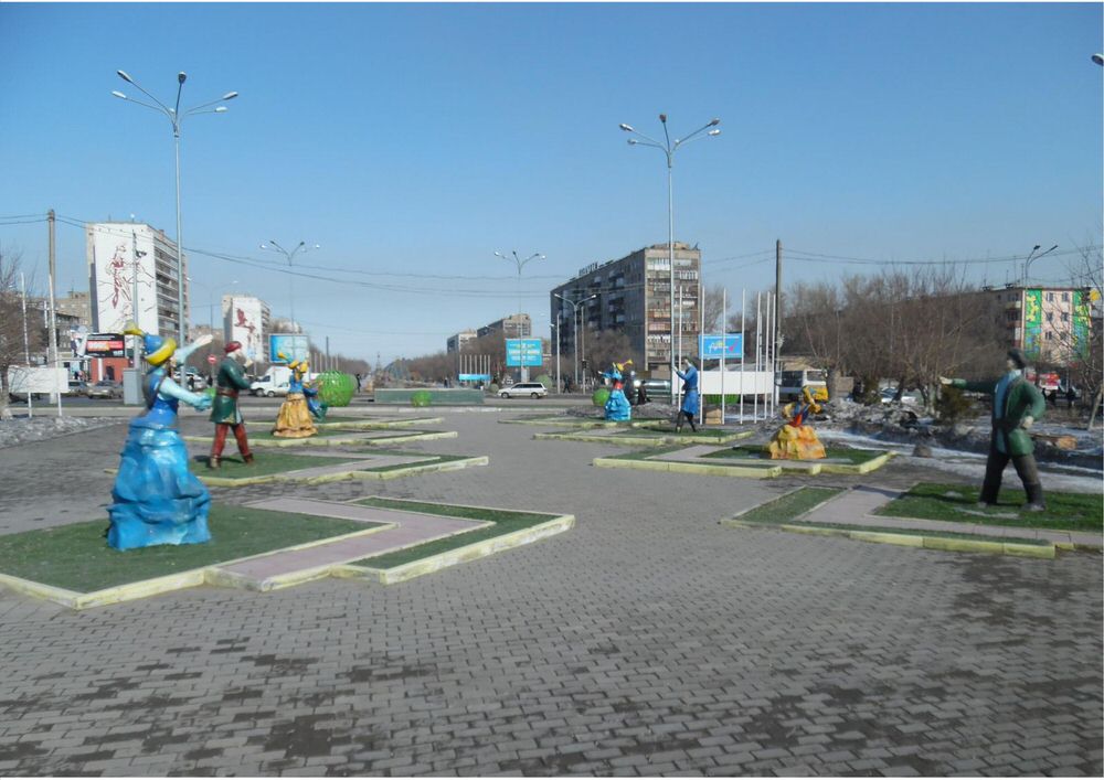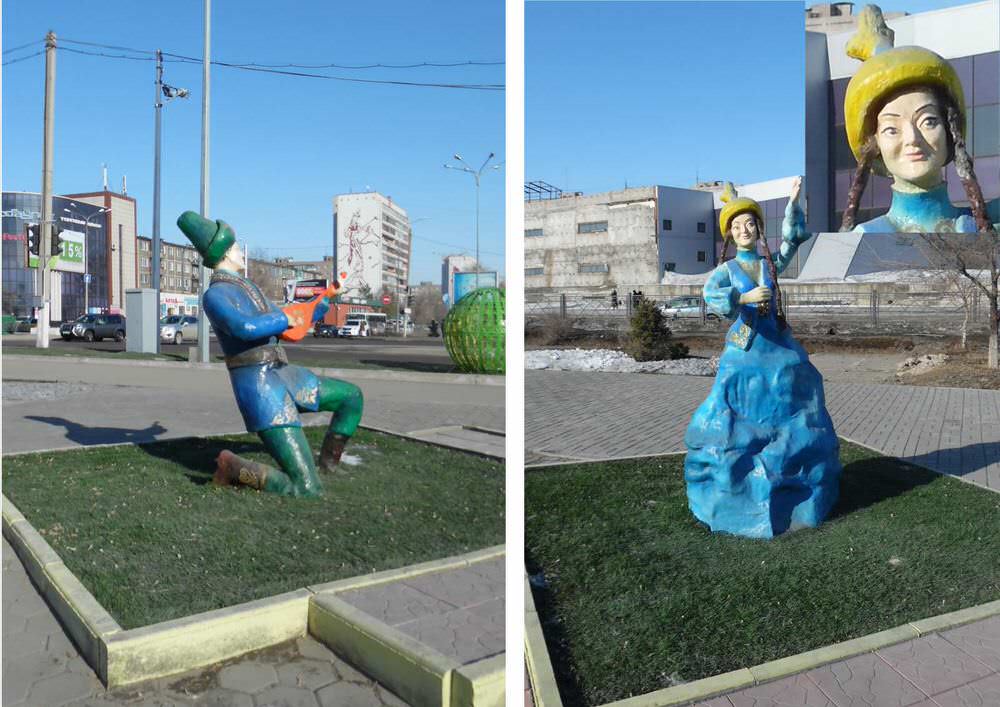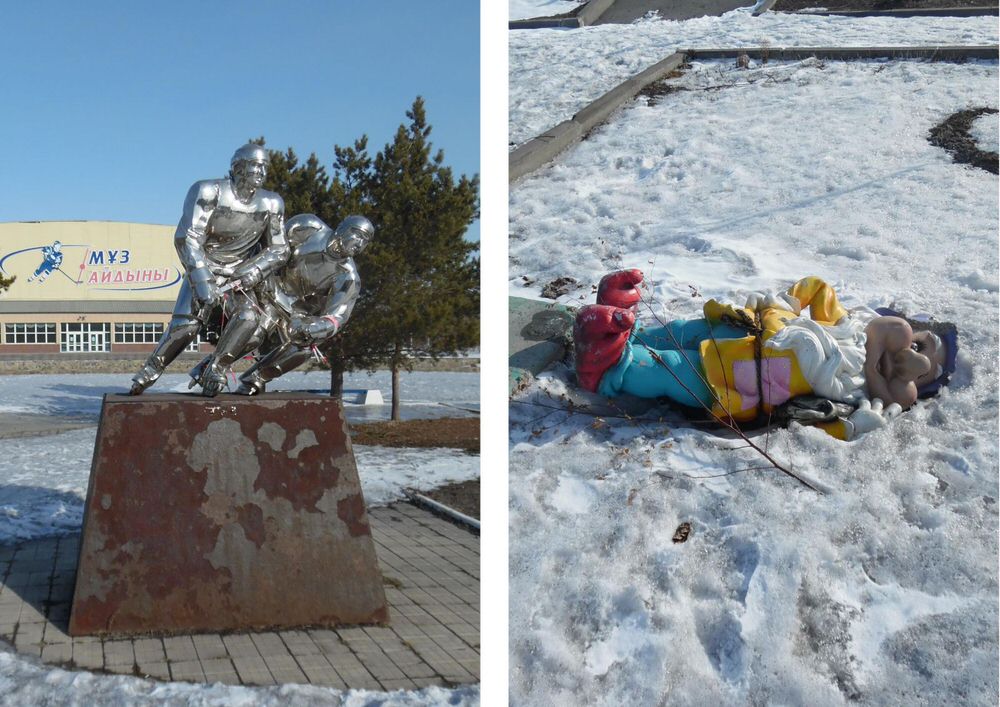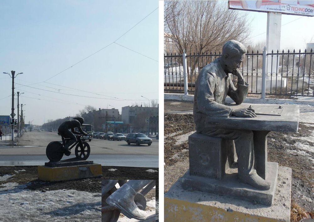 Наглый велосипедист в зимних сапогах все норовит выскочить на оживленный перекресток, а грустный китаец играет в китайские же шахматы. Правда, фигуры у него все украли, оттого он и загрустил. Жители Темиртау любят фотографироваться с гостем из Поднебесной, предварительно поставив на столик бутылку водки. Ввиду запрета рекламы алкоголя такие фото не выкладываем.