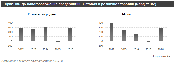 Отрасль оптовой и розничной торговли быстро восстановилась после убыточного 2015 года – за 2016 год предприятия торговли совокупно зафиксировали чистый результат деятельности в размере 587 миллиардов тенге. Напомним, в предыдущем году в секторе был зафиксирован чистый убыток на 37 миллиардов тенге.