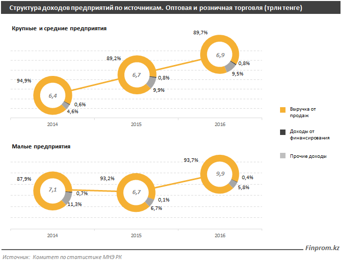Наиболее активно в 2016 году работал малый сектор в торговле – за год доходы таких предприятий увеличились на 3,3 триллиона тенге, или на 49%, и составили почти 10 триллионов тенге.