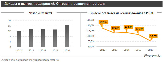 Предприятия торговли в 2016 году показали резкий рост доходов, в то время как реальные доходы самих казахстанцев упали. За прошлый год совокупный объем доходов крупных, средних и малых участников рынка составил 16,8 триллиона тенге. Это на четверть (26%) больше уровня 2015 года. При этом реальные денежные доходы населения РК за год сократились на 4,5%.