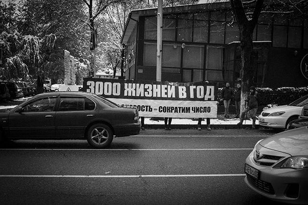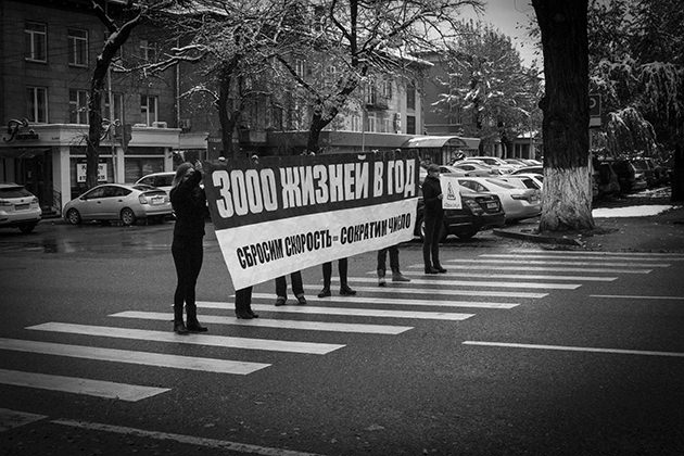 На несколько секунд группа людей остановила движение автомобилей перед пешеходными переходами, продемонстрировав водителям, их пассажирам и прохожим сообщение: «3000 жизней в год. Сбросим скорость – сократим число».