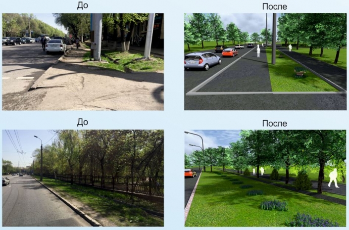 Проекты предполагают укладку брусчатки, прокладку арыков, установку урн и лавочек, демонтаж ограждений и др. Будет установлен спортивный инвентарь, устроены детские площадки, посажены деревья, живая изгородь, клумбы и др.