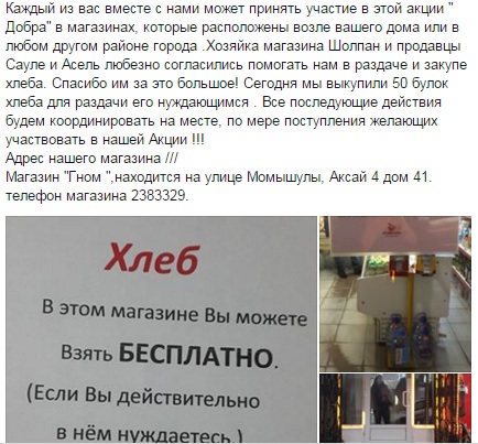 Акция «Возьми хлеб бесплатно» проходит в одном из алматинских магазинов, передает корреспондент агентства.
