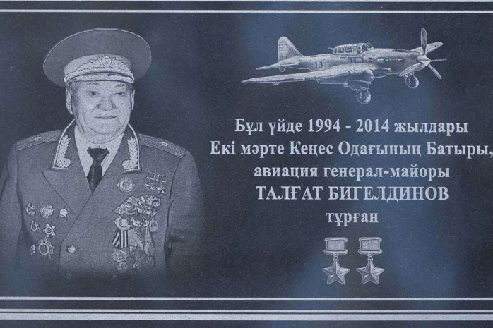 Сегодня в Алматы состоялось открытие мемориальной доски летчику-штурмовику, дважды Герою Советского Союза, генерал-майору авиации Талгату Бигельдинову.