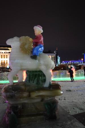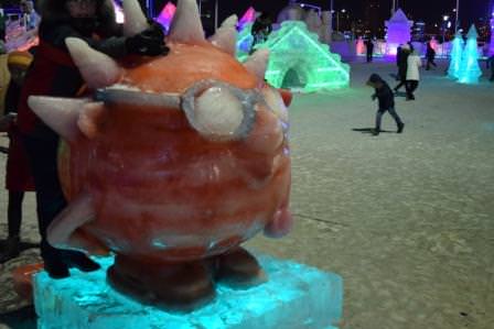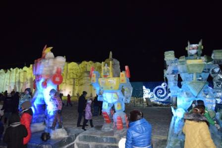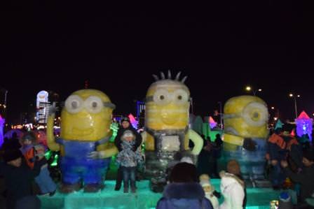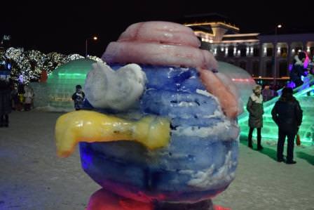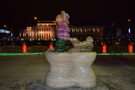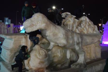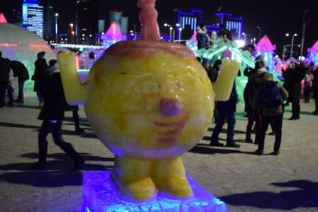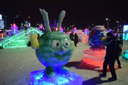 Городок условно разделили на две части. С одной стороны работали китайские мастера, с другой - казахстанские. «Китайская сторона» - это входная группа и скульптуры из цветного льда и снега. Персонажи тоже, в основном, современные: миньоны, смешарики, даже Дед Мороз со Снегурочкой с лицами представителей Поднебесной.