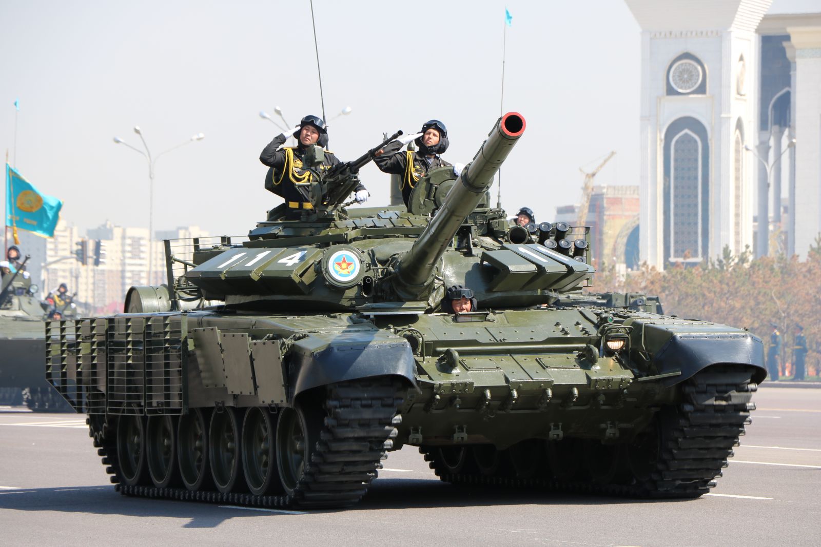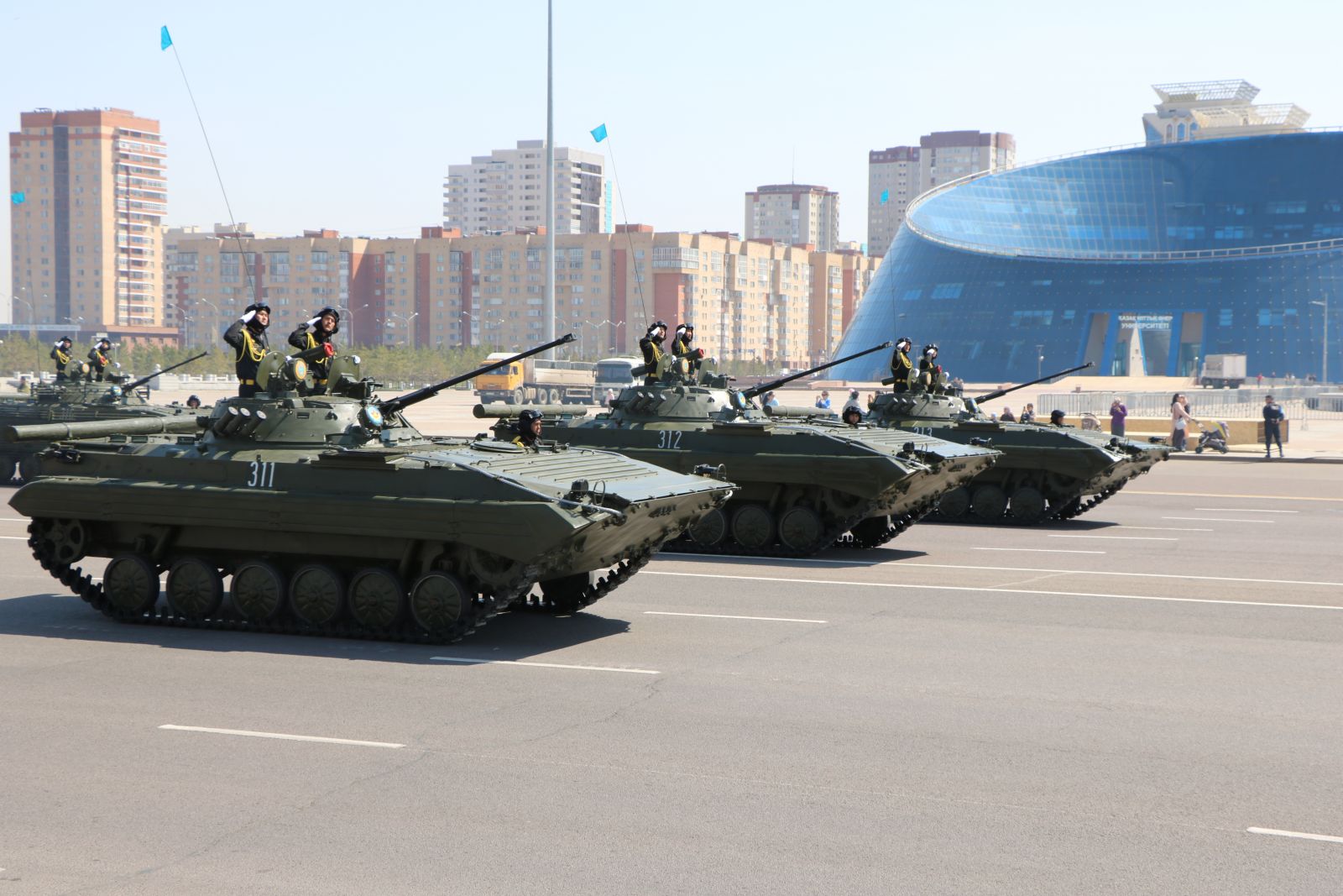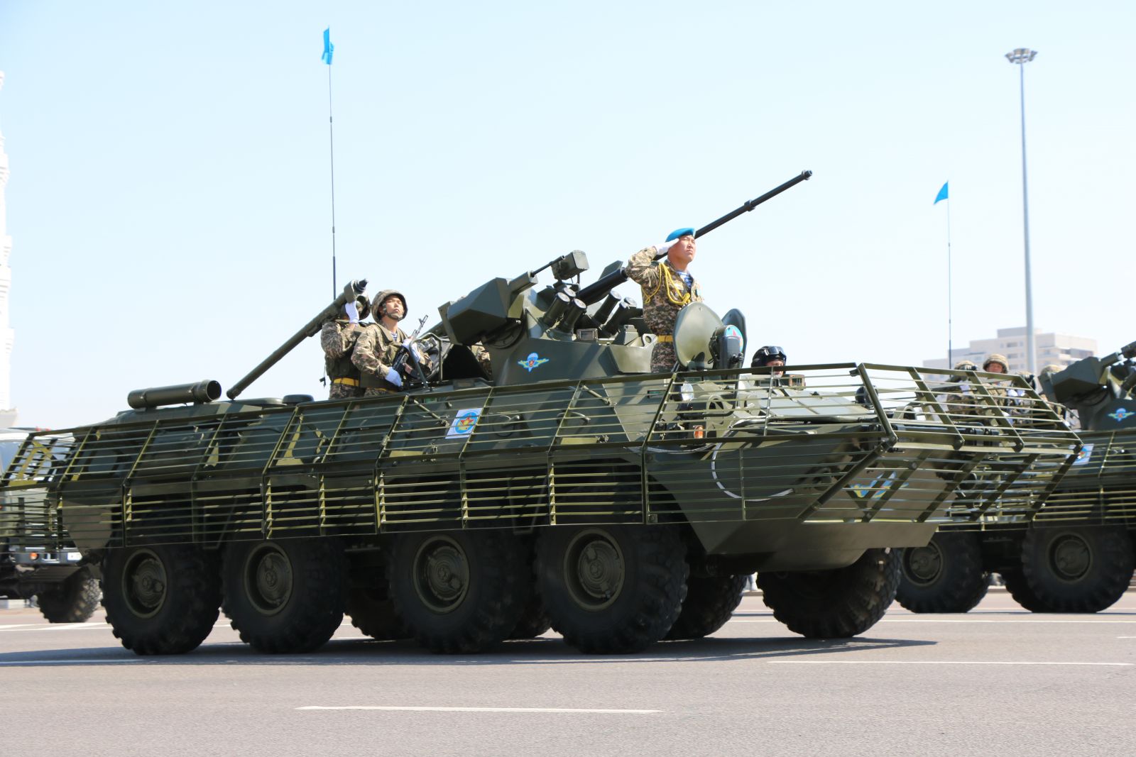 «Боевая машина «Арлан» произведена у нас, в Казахстане, в 2016году. Машина бронированная, легко управляется – экипаж 10 человек. Она предназначена для ведения разведки и для боев в городских условиях. В этом году «Арлан» впервые участвует в параде», – проинформировал журналистов Ахметбеков.