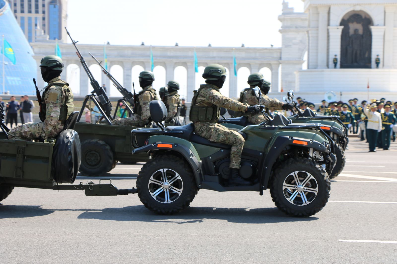 Также на репетиции была показана боевая машина «Арлан» – бронеавтомобиль произведен на казахстанском заводе. Отечественным продуктом уже заинтересовались иностранные военные. По словам начальника бронетанковой службы десантно-штурмовых войск Аскара Ахметбекова, на «Арлан» «пересаживаются» разведывательные полки ВС РК.