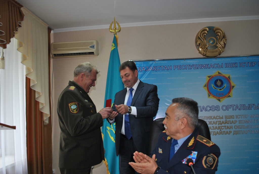 Заместитель министра отметил большую организационную работу, проделанную П. Филипповым, и вручил ему нагрудный знак «Азаматтық қоргау органдарының құрметті қызметкері».