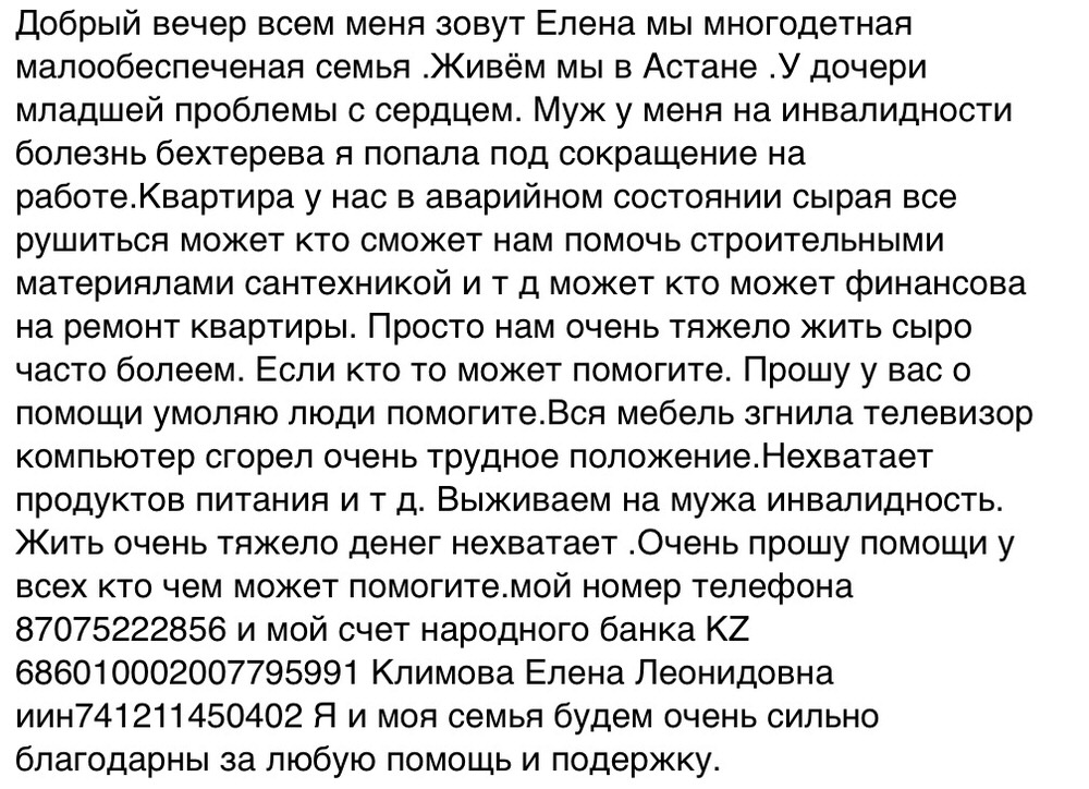 Мать была единственным кормильцем в семье, но и тут случилось неладное. Елена работала поваром в столовой, но попала под сокращение и сейчас семья вынуждена перебиваться на пособие мужа по инвалидности. Сейчас пятеро человек буквально выживают на 23 тысячи тенге в месяц и, естественно, они никак не смогут сделать хотя бы простой ремонт с помощью своих средств. Елена признается, что пытается максимально держать детей вне дома, отравляет их на улицу, потому что каждый вдох в таких условиях чреват для их детского здоровья. Климова десятки раз обращалась во всевозможные инстанции, но в ответ слышала только обещания, однако на деле, квартира продолжает гнить вот уже 4 года.