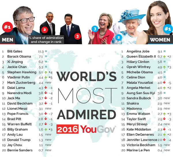 Лидером списка третий раз кряду стал основатель Microsoft Билл Гейтс, за ним идут президент США Барак Обама, председатель КНР Си Цзиньпин и актер Джеки Чан.