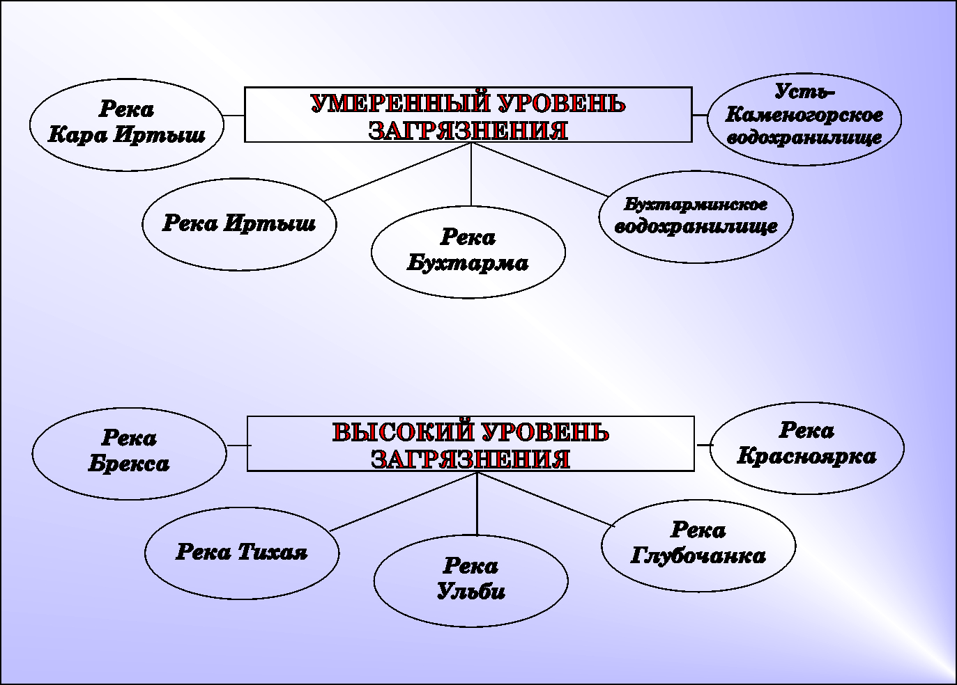 В реке Тихая превышение ПДК по следующим веществам: аммоний солевой – 3,3, азот нитритный – 2,0, цинк – 12,0, марганец – 10,0, медь – 7,8. В реке Ульба: цинк – 15,9, марганец – 8,5, медь – 4,6. В реке Глубочанка: азот нитритный – 1,2, цинк – 22,0, марганец – 13,4, медь – 7,7. Река Красноярка: цинк – 14,5, марганец – 6,3, медь – 5,3. В реке Уба: медь – 2,7, марганец – 2,3. В реке Емель: сульфаты – 1,5, азот нитритный – 3,4, железо общее – 1,8, аммоний солевой – 1,3, марганец – 3,0, медь – 1,9.
