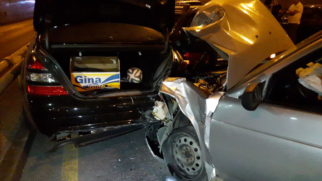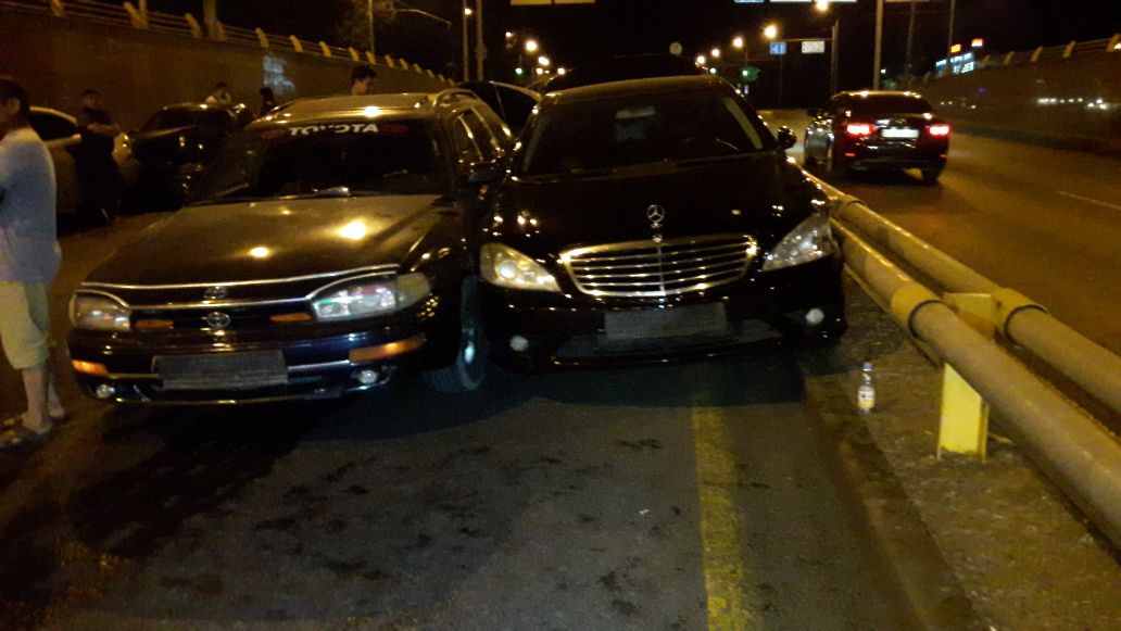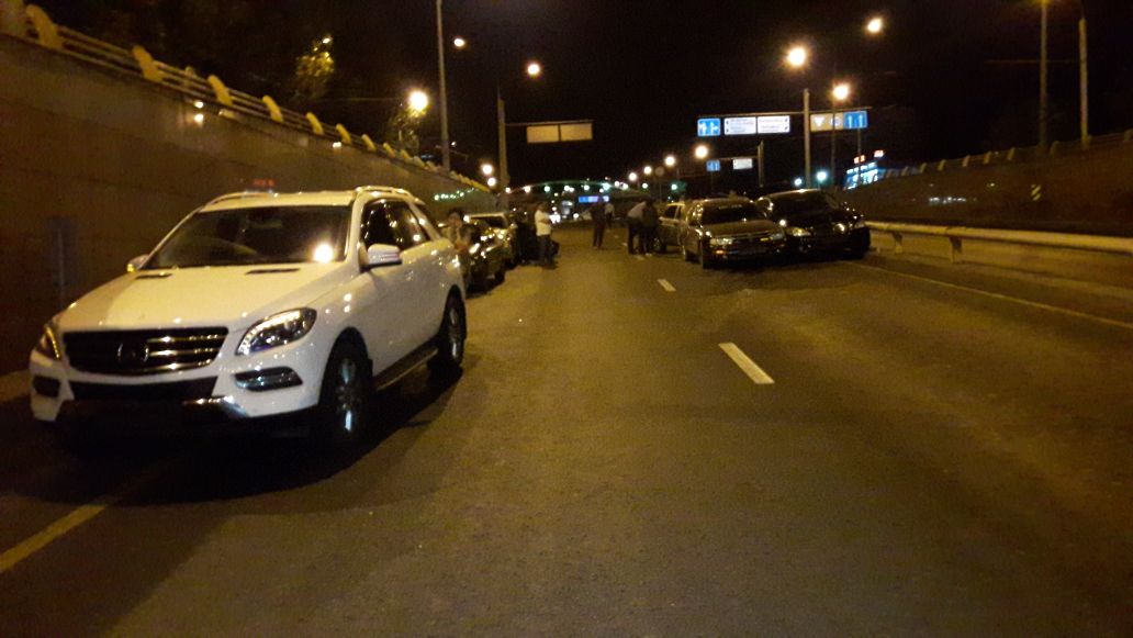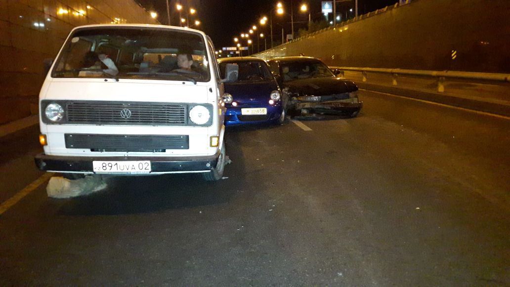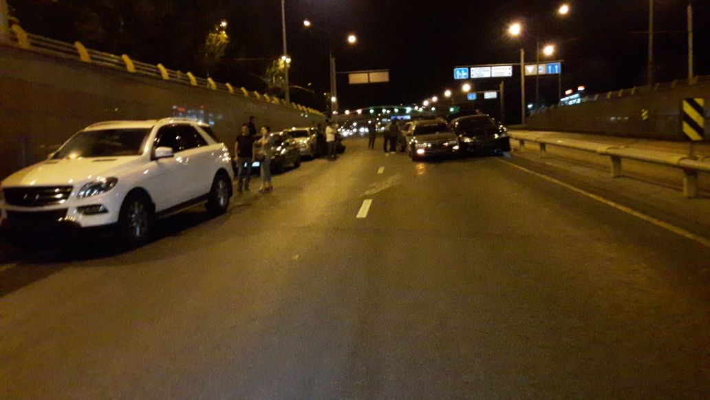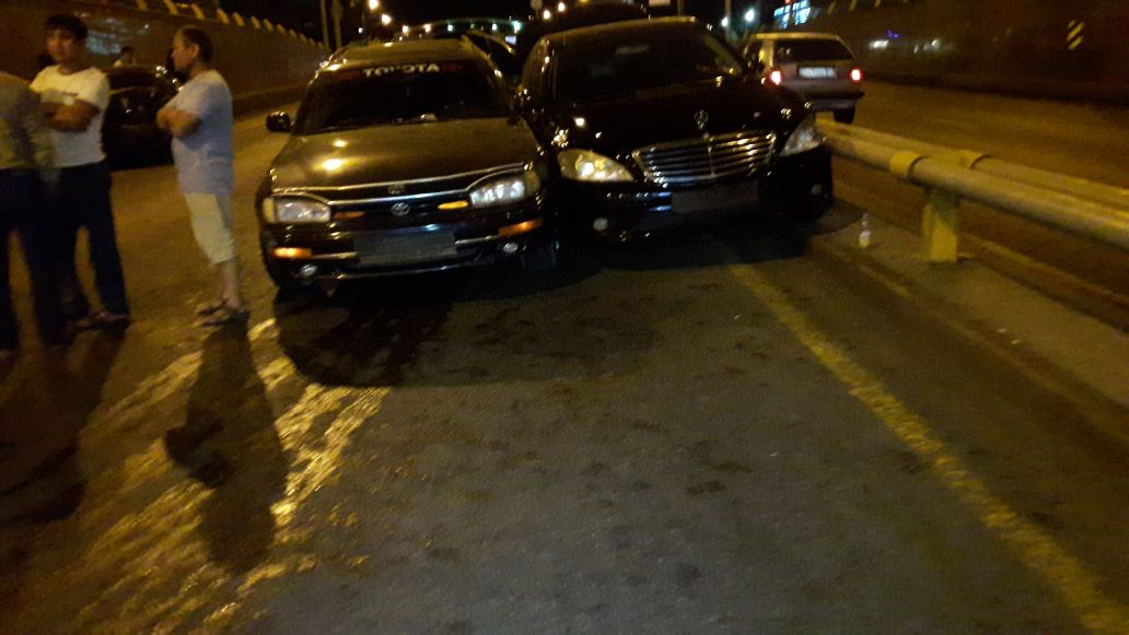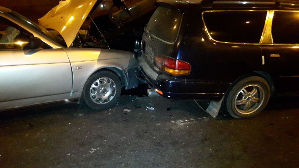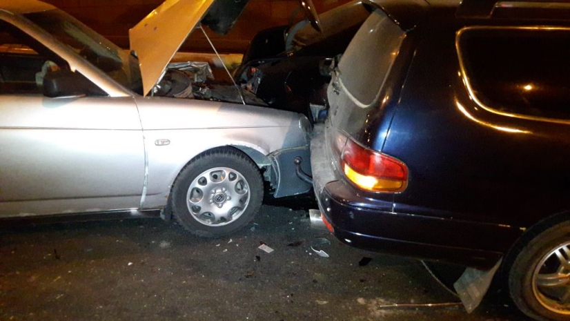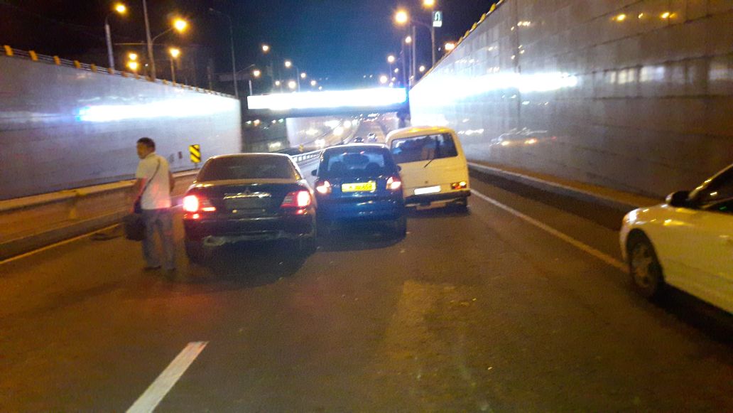 Большой поток машин в северном направлении и первое ДТП спровоцировали еще два ДТП. Вскоре столкнулись Мерседес, Тойота Карина и Лексус. Девушка за рулем Мерседеса, как она рассказывает, начала притормаживать, услышав свист, и в этот момент ее автомобиль сзади ударила Тойота Карина. Тойоту откинуло на Лексус.