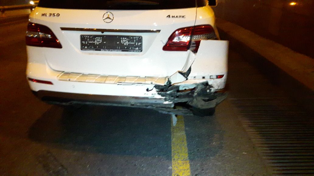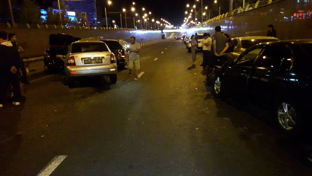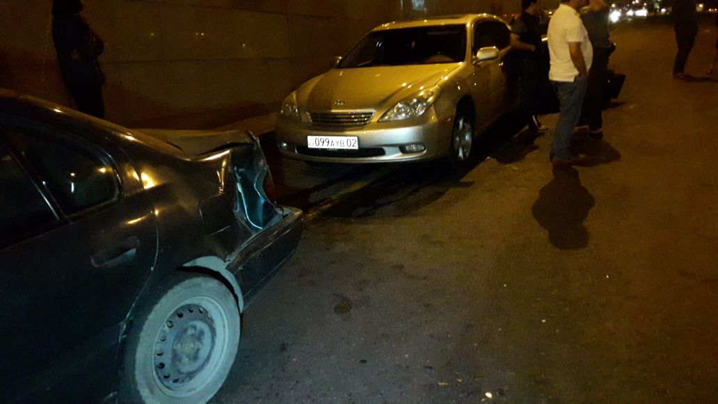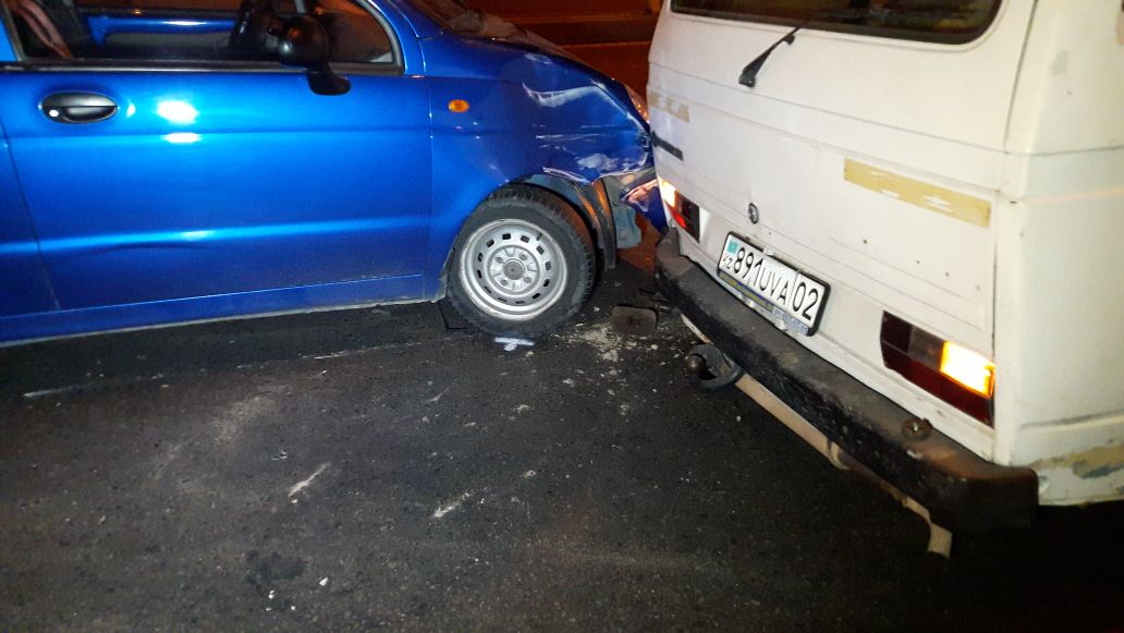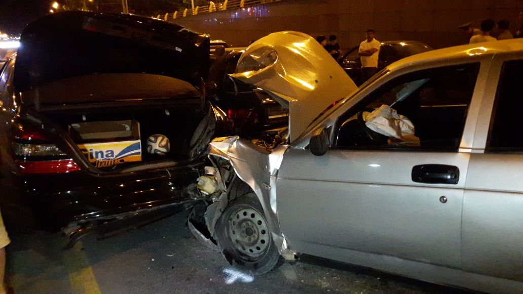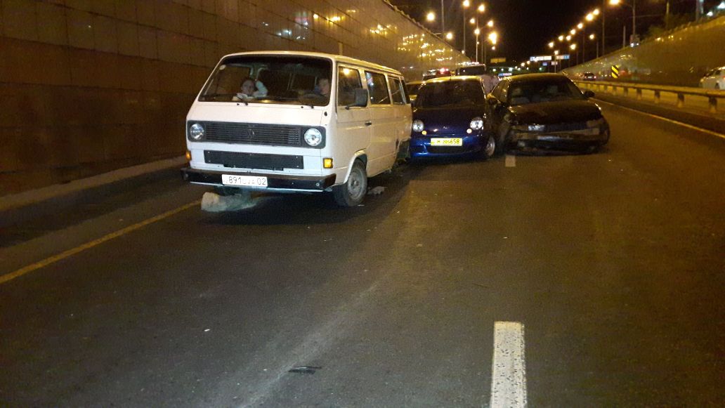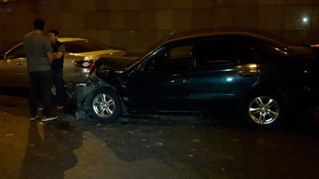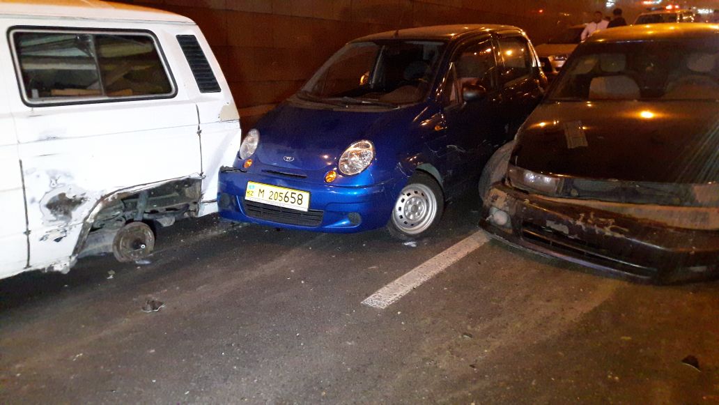 У микроавтобуса Фольксваген Транспортер на ходу оторвало колесо. Водитель остановился, включил аварийку и хотел исправить неисправность. В это время в северном направлении двигались автомашины Дэу Гентра, Дэу Матис и Митцубиси Галант. Матис двигался в крайнем правом ряду, Гентра – в крайнем левом ряду. Между ними хотел проскочить Митцубиси Галант. Как утверждают многочисленные очевидцы, он маневрировал, ехал без госномеров. Водитель Митцубиси не справился с управлением и ударил сначала Дэу Матис, который отбросило к стоящему на аварийке Фольксвагену Транспортер. После удара Матис врезался в Дэу Гентра. В этом ДТП пострадали две девушки из Дэу Матис – водитель и пассажирка. Их с различными травмами госпитализировали в больницу. Из-за этого ДТП на Саина образовалась огромная пробка.