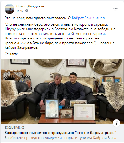 «Это не снежный барс, это рысь, и лев, в которого я стрелял. Шкуру рыси мне подарили в Восточном Казахстане, а лебеди, не помню, за то, что я занимаюсь историей, мне их подарили. Поэтому здесь ничего запрещенного нет. Рысь у нас не краснокнижная. Это не барс, вам просто показалось», – пояснил журналистам Кайрат Закирьянов.