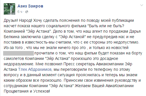 Режиссер фильма «Быть или не быть» Азиз Заиров принес авиакомпании «Эйр Астана» извинения на своей странице в Фейсбуке за обвинение в нарушении авторских прав, передает ИА Total.kz.