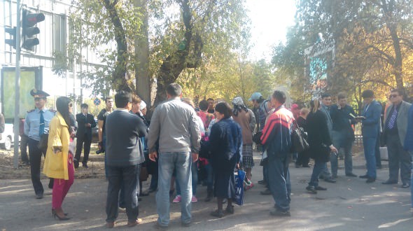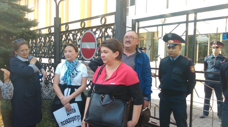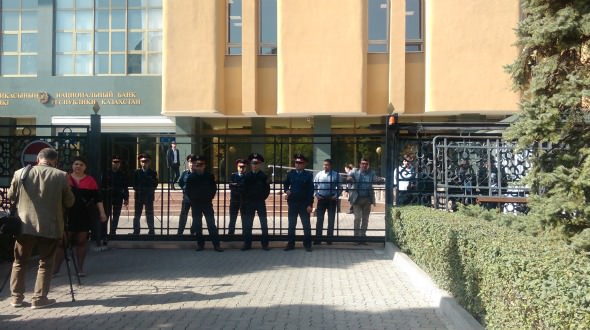 Собравшиеся грозили перекрыть улицу Сатпаева, если к ним не выйдет заместитель председателя правления НБ Александр Терентьев. Полиция задержала четверых активистов.