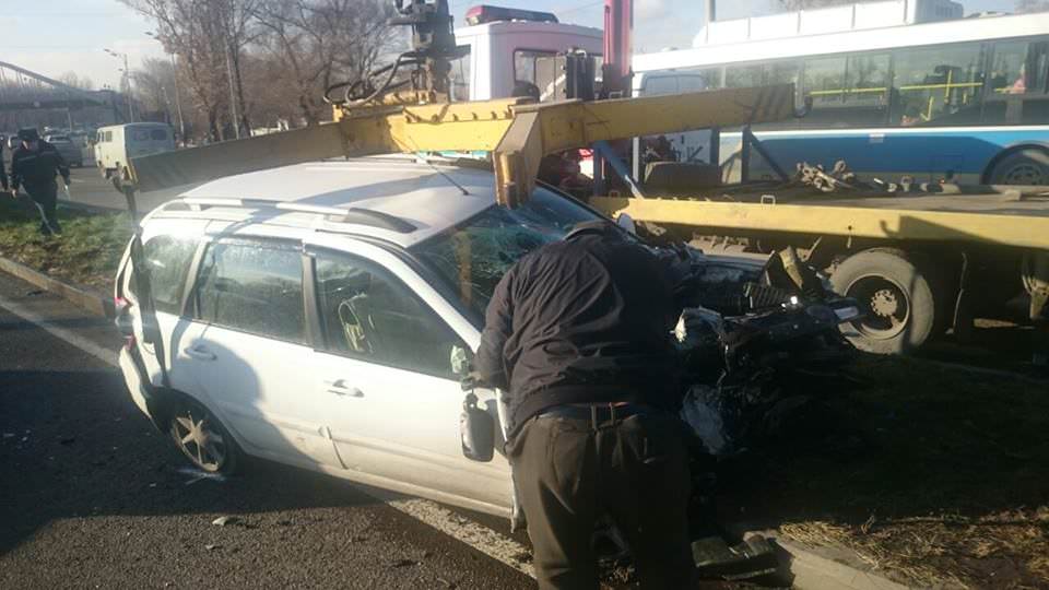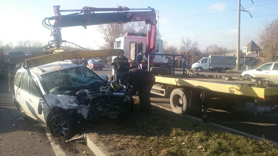 ДТП с участием автомашины Лада-Калина и КамАЗа произошло сегодня на пересечении проспекта Рыскулова и улицы Шемякина, передает корреспондент Total.kz.