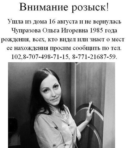 Близкие Ольги Чупразовой просят всех, кто, возможно, видел ее или располагает какой-либо информацией, связаться с ними по следующим номерам телефонов: 8-707-498-71-15 (Ирина), 8-747-448-18-28 (Анастасия).