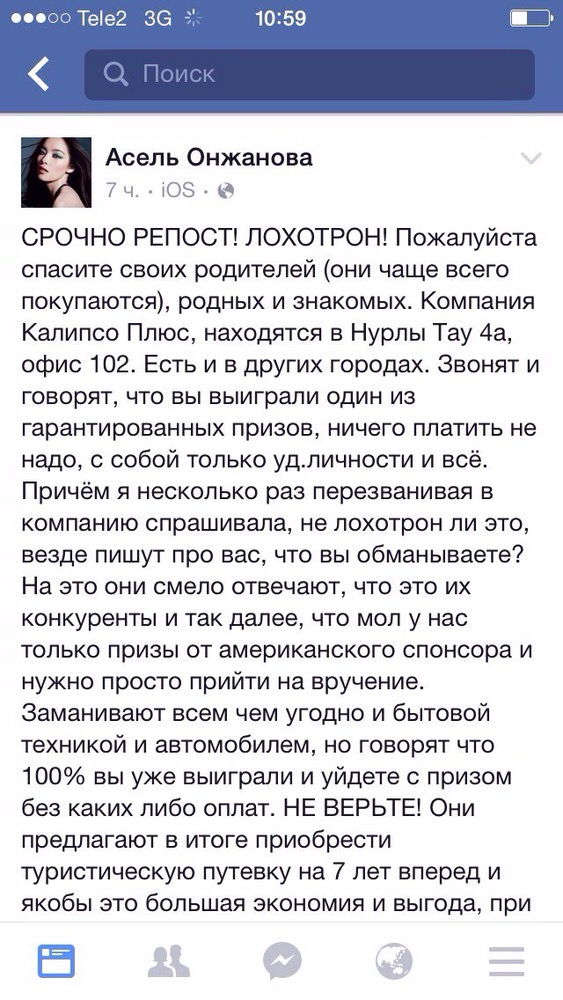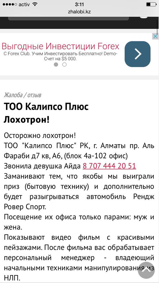 Одна из пользователей социальной сети обвиняет компанию «Калипсо Плюс» в мошенничестве: «Звонят и говорят, что вы выиграли один из гарантированных призов, ничего платить не надо, с собой только удостоверение личности и всё…. НЕ ВЕРЬТЕ! Они предлагают в итоге приобрести туристическую путевку на 7 лет вперед и якобы это большая экономия и выгода… нужно сразу с ними проехать в банк или домой под сопровождением и оплатить тур в который вы поедете неизвестно когда… Их компания не туристическая и все призы бесплатны, если выиграете путевку то она полностью проплачена спонсорами и билеты тоже. В конечном итоге, вместо обещанного гарантированного приза, выдают путевку, но за нее нужно платить, 60000 тг на месте и авиабилеты и визы и так далее».