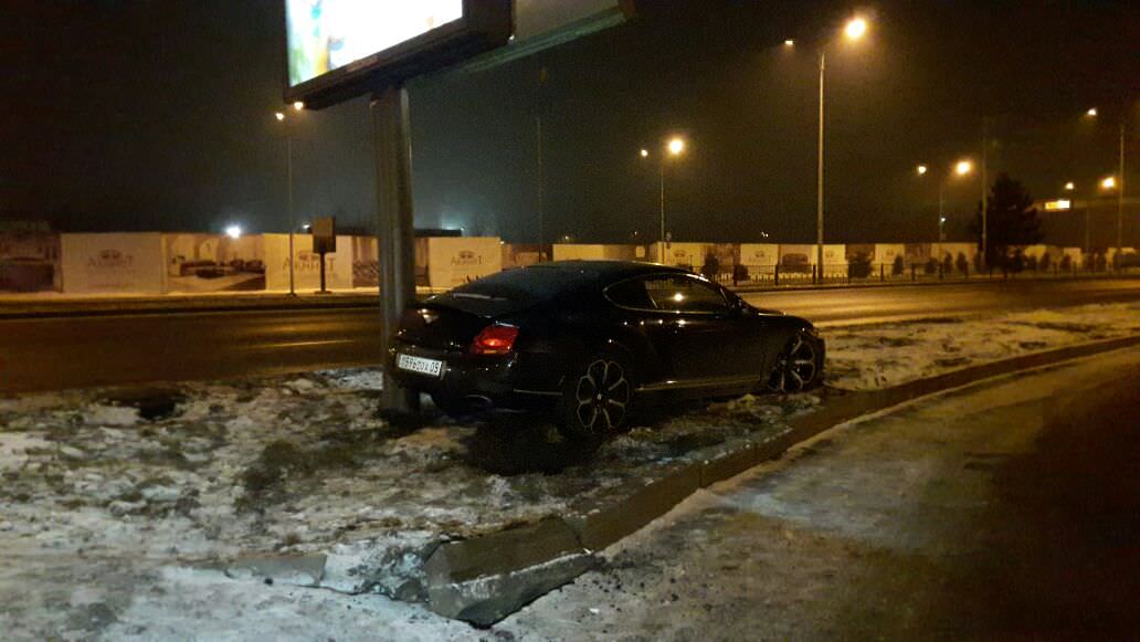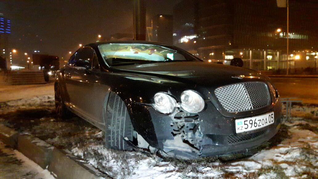 Дорожный инцидент произошел на пересечении Аль-Фараби и Сейфуллина. По словам очевидцев, автомобиль Bentley двигался в южном направлении, при повороте направо его занесло. Затем элитное авто снесло дорожный знак и задело рекламный билборд.