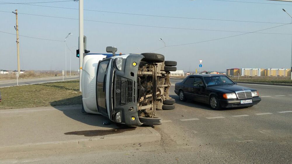 В результате столкновения Газель ударилась о бордюр и опрокинулась.
