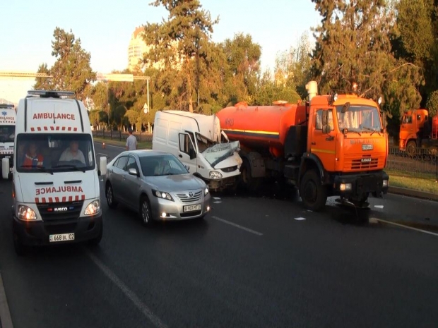 Белый микроавтобус на полном ходу врезался в «КамАЗ», который поливал клумбы на дороге.