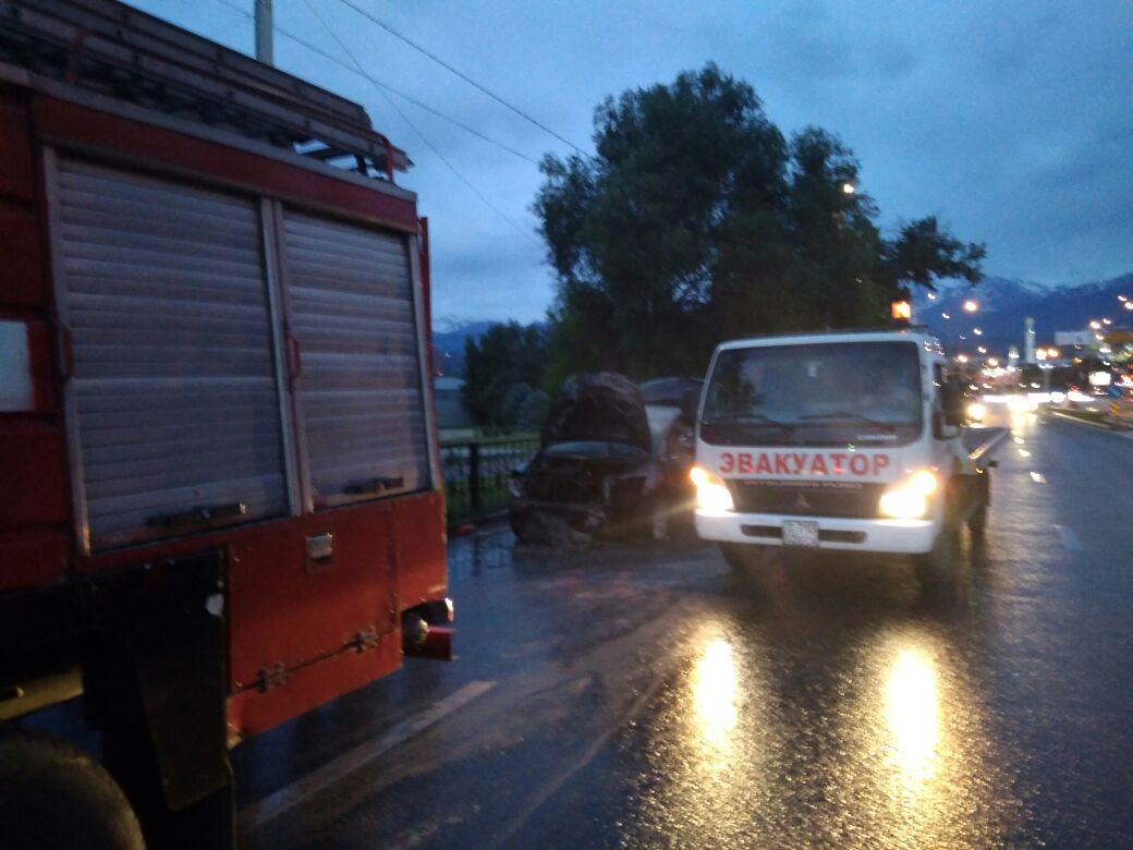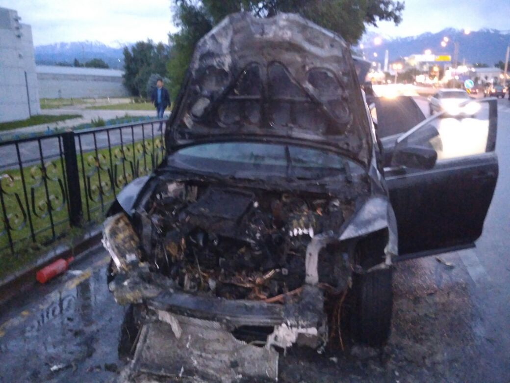 По словам очевидцев, внедорожник «Мазда» двигался в южном направлении по Суюнбая. Почти на пересечении с улицей Райымбека из машины резко повалил дым. Водитель остановился, хотел потушить своими силами, но не смог.