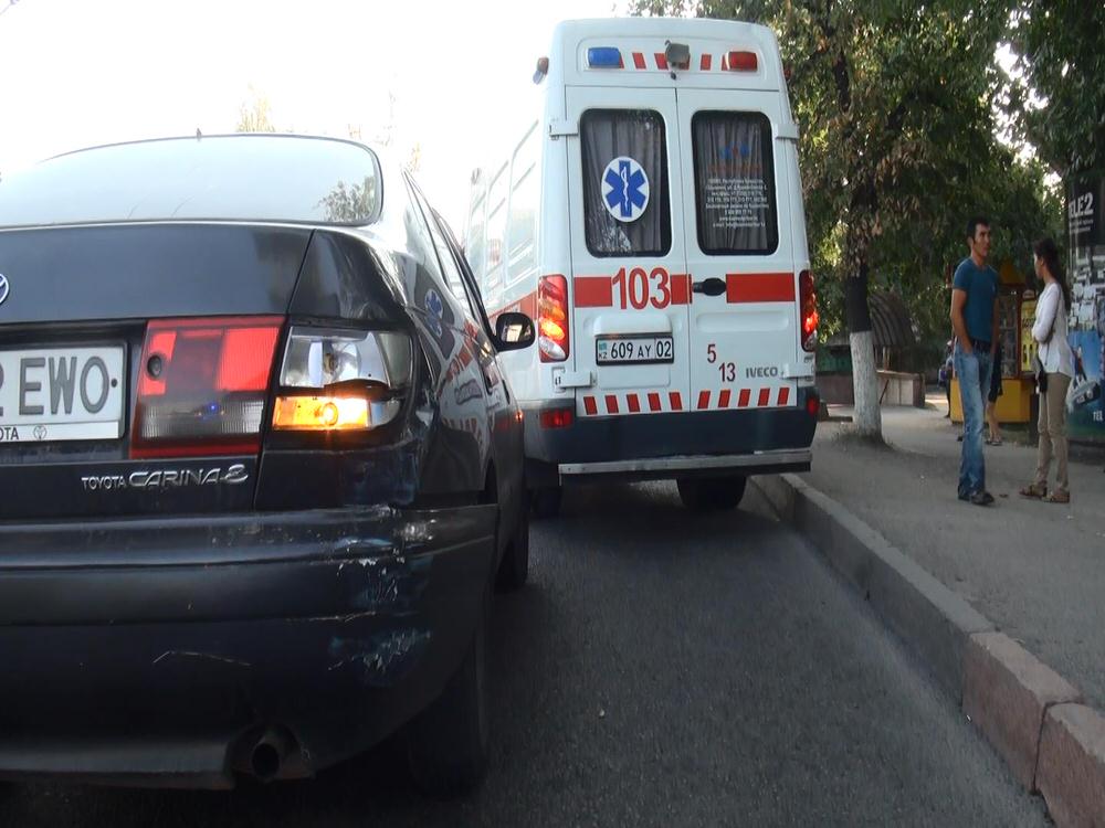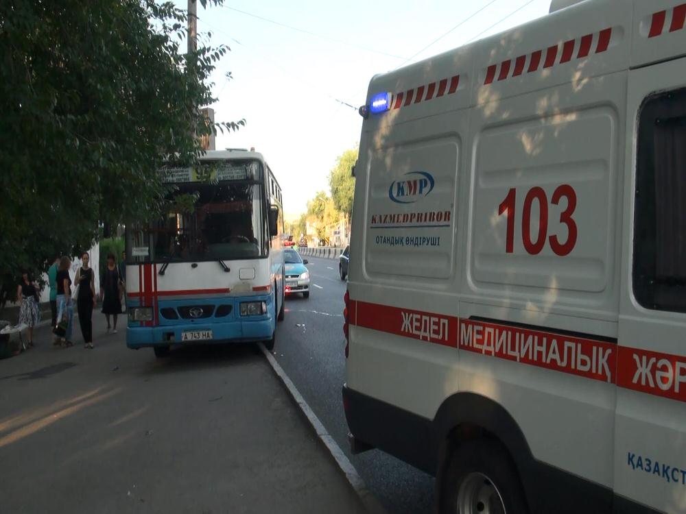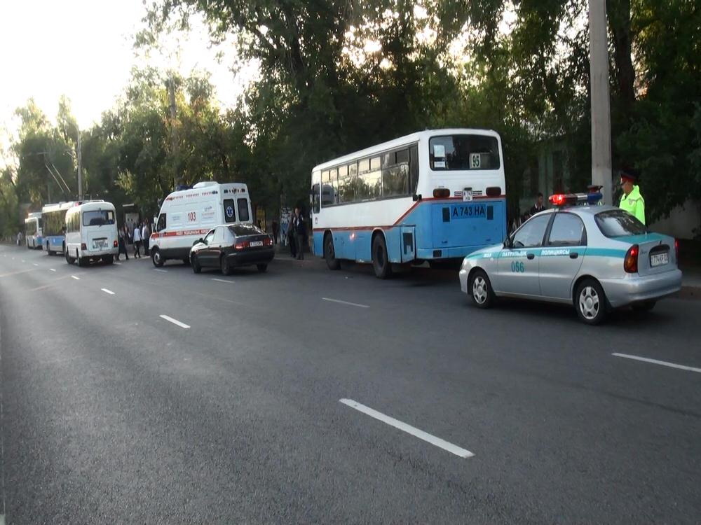 Водитель автомашины Toyota, двигаясь в восточном направлении по улице Жандосова, остановился, чтобы высадить девушку. В этот момент он увидел приближающийся на большой скорости автобус 95 маршрута. Водитель легковой автомашины хотел уехать, но не успел - автобус ударил автомобиль Toyota, а затем и девушку, которая стояла рядом с машиной.