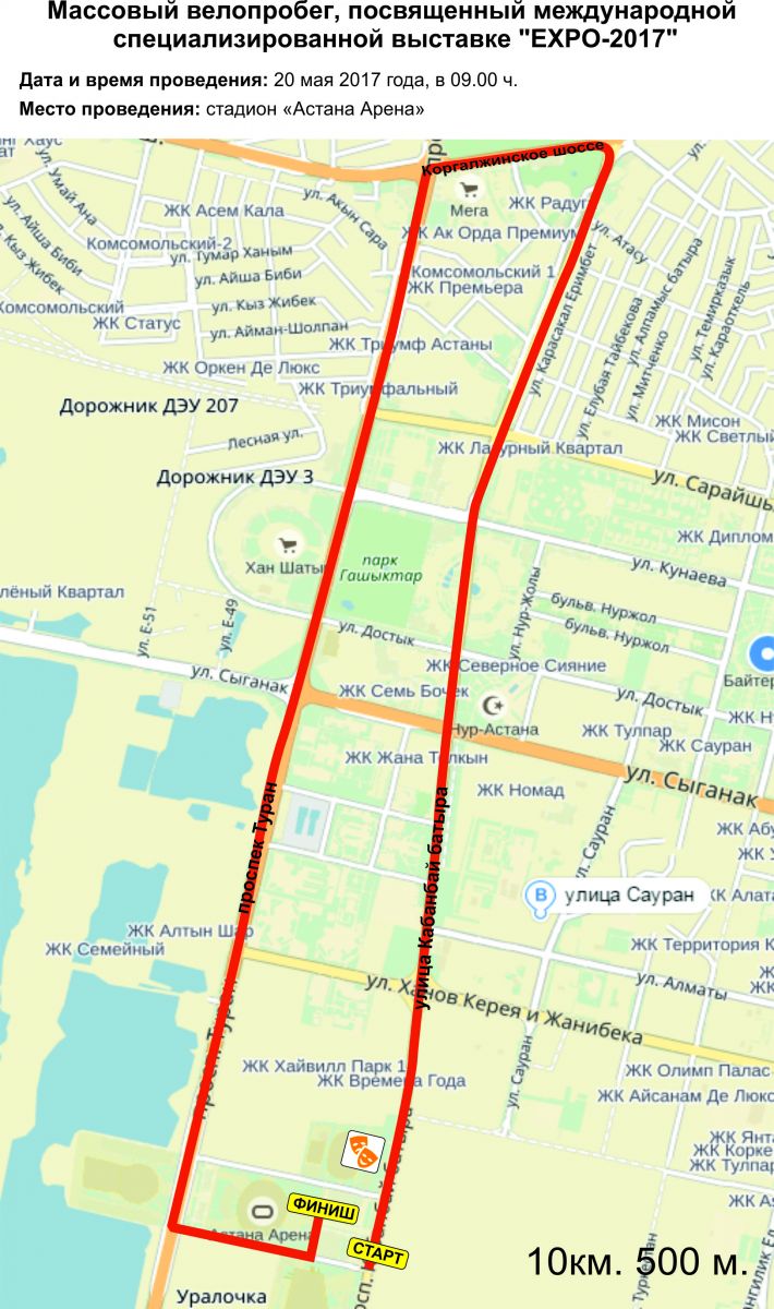 Регистрация участников начнется в 8:00, старт будет дан в 9:00 на ул. Кабанбай батыра напротив стадиона «Астана Арена». Желающим будет предоставлена возможность аренды велосипеда.