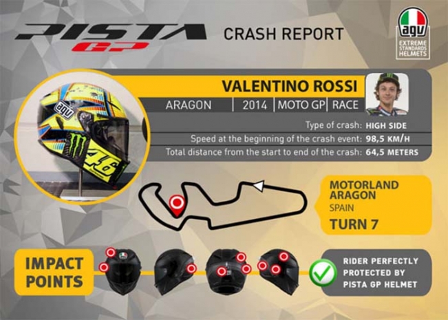 Во время начала инцидента, произошедшего на 7 повороте испанской трассы, скорость гонщика была 98,5 км/ч. Дистанция от начала до конца хайсайда - 64,5 м. На инфографике также представлено фото шлема Pista GP, в котором ехал Валентино, метками отображены точки ударов на шлеме.
