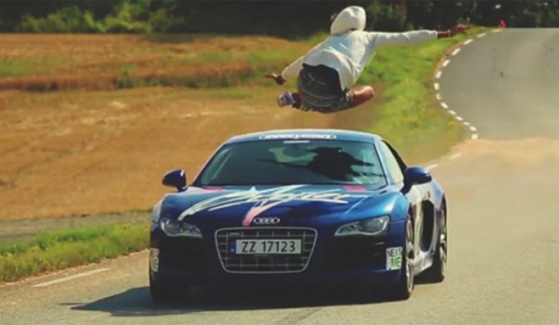 Безумный финн перепрыгивает Audi R8 на скорости 150 км/ч!