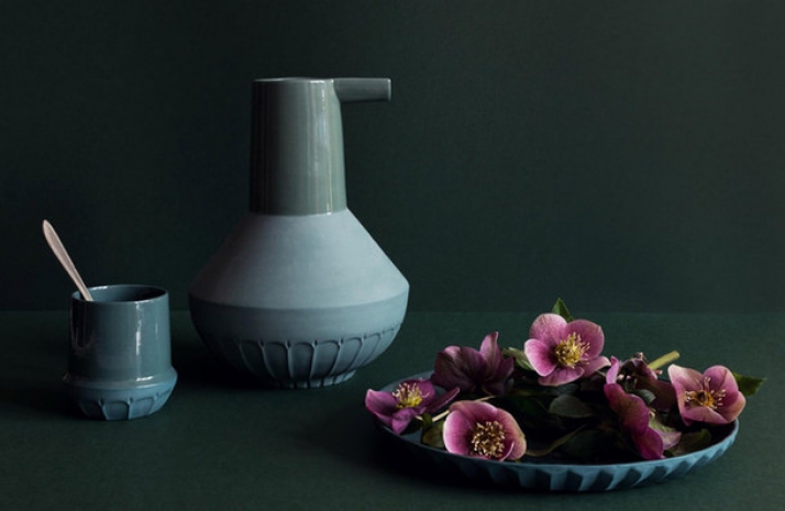 В коллекции этого года – ребристые стаканы и тарелки с глазированной внутренней поверхностью и неровным краем, бисквитно-глянцевые кувшины и графины, вазы для цветов, похожие на елочные игрушки из бумаги, и другая посуда.