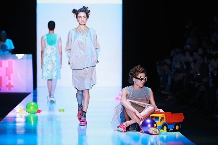 То, что главной темой весенне-летней коллекции Ria Keburia будет детство, мы знали заранее: Рия активно делилась деталями готовящегося показа на своей странице в Instagram, выкладывая и фрагменты ткани с принтами, и эскизы очков с пластиковыми «бровками», созданными совместно с российской маркой Fakoshima, рассказывает Вuro247.ru. На вчерашнем шоу все разрозненные кусочки сложились наконец в целую картину. Модели на московском показе грузинского дизайнера действительно превратились в больших детей: все, как девушки, так и мужчины, надели пастельных расцветок платьица-сорочки, большие пушистые тапочки, а по полупрозрачным тканям рассыпались принты в виде детских игрушек.