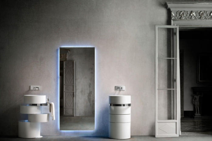 После успеха с выпуском необычного ковра и офисного стола дизайнер Alessandro Isola решил заняться мебелью для ванных комнат. В сложенном виде умывальник представляет собой простой белый цилиндр, разделенный на несколько частей. Верхний отсек – это раковина, а четыре нижних представляют собой встроенные системы хранения. Модель дополнена хромированной окружностью, предназначенной для полотенец.