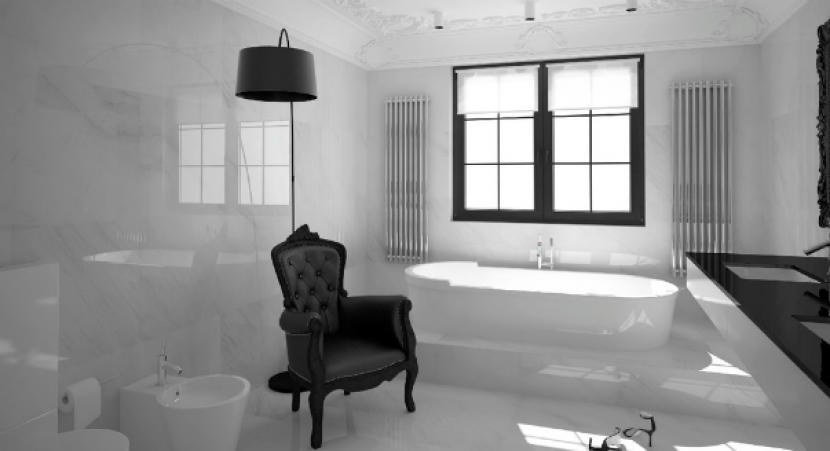 Сложно представить, как в одном помещении могут гармонично соседствовать солидное кресло с изогнутой спинкой и стиральная машина. Поэтому лучше взглянем на это своими глазами, рассказывает 4living.ru. Оформление ванной комнаты на фото – это современная и свободная трактовка дизайнером стиля барокко. В отличие от канонического интерьера в этом ключе, эта ванная комната не перегружена декором. Все лаконично, выразительно и оставляет простор для воображения. Здесь достаточно много четких горизонтальных линий, в то время как классическое барокко обычно ассоциируется с изогнутыми контурами и элементами. На стилизацию намекает отделка потолка, резная оправа зеркала и витиеватая опора столешницы. Кресло характерной формы притягивает внимание. В проекте ванной используется не типичный для этого стиля контраст цветов: базовый белый и усиливающий его черный. Казалось бы, от классического барокко здесь используются только определенные элементы, но интерьер получился величественным и даже несколько драматичным.