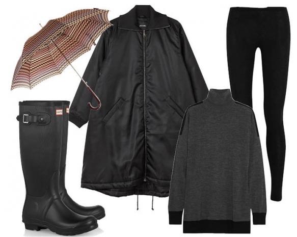 Вопросов о том, с какой обувью носить плащ, отправляясь на природу (кстати, легкий моросящий дождь придает осеннему лесу дополнительные краски, а воздух наполняется такой свежестью и ароматами, что отказаться от такой прогулки невозможно), быть не может — идеальной парой к непромокаемому пальто для уикенда за городом станут классические высокие резиновые сапоги. Ну а грамотно подобранные к ним плотные легинсы или узкие джинсы-стретч в компании с тонкой кашемировой водолазкой обеспечат комфортные ощущения на всю прогулку.