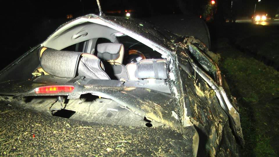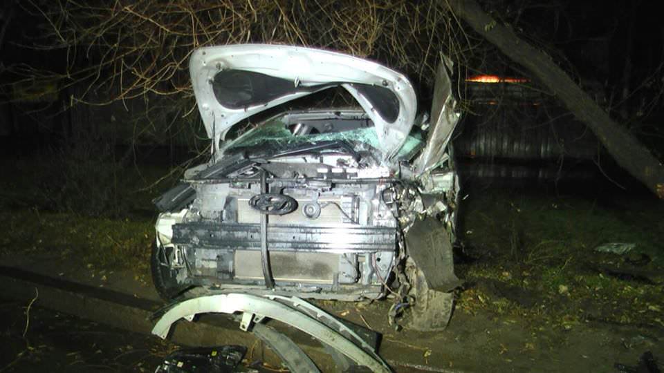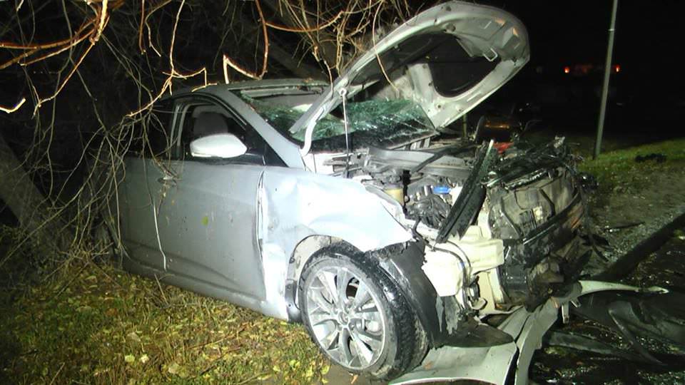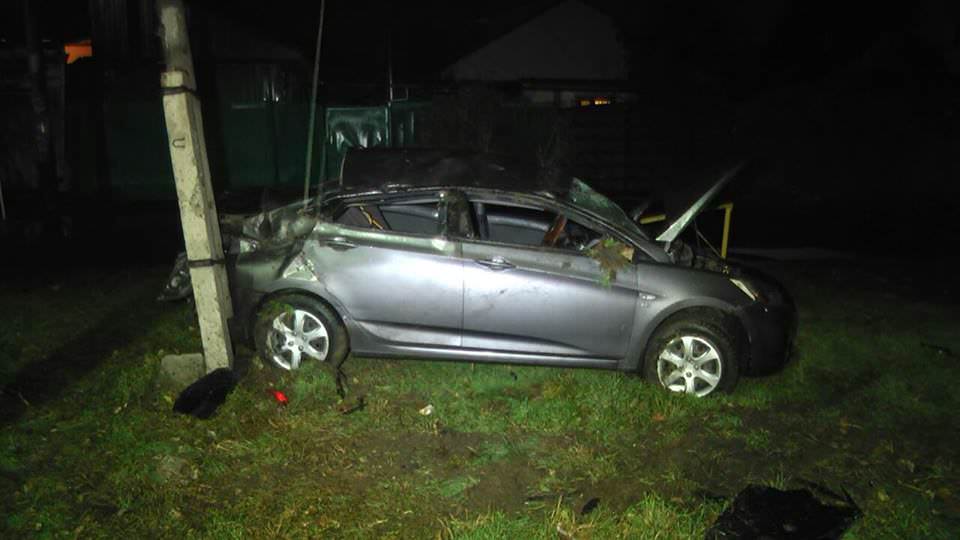 Видимо, по причине плохих погодных условий и мокрого асфальта на повороте серебристый Hyundai занесло, и он столкнулся с темным Hyundai. В результате сильного удара тот перевернулся и врезался в столб.