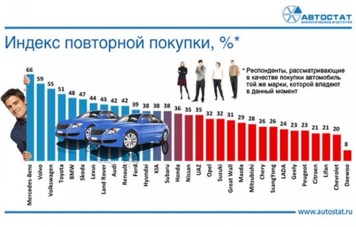 Аналитики агентства «Автостат» рассчитали так называемый «Индекс повторной покупки». Всем автовладельцам задавался вопрос: «Какие марки автомобилей вы рассматриваете в качестве следующей покупки?». В рейтинге указан процент опрошенных, которые в качестве следующей покупки рассматривали ту же марку автомобиля, которой владеют в настоящее время, пишет Авто@mail.ru.