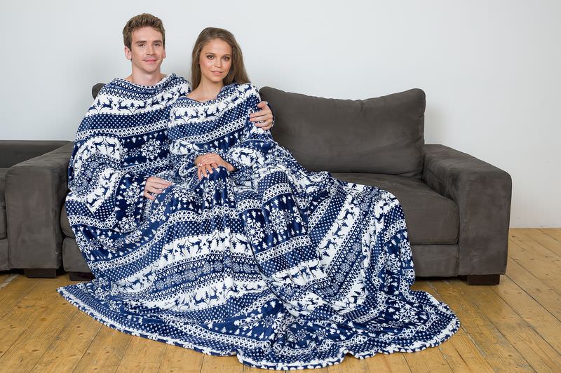 Плед с рукавами на двоих хорош не только для совместного просмотра фильмов на диване. Уютный, теплый подарок подойдет для любителей загородной романтики: укутавшись со всех сторон, можно отправляться смотреть на звезды и встречать рассвет плечом к плечу с любимым, не клацая зубами от холода. В комплект к пледу можно добавить набор из трех варежек. Две из них отдельные, а одна - общая. Варежка состоит из двух манжет и одной основы. Теперь на прогулке вы всегда будете чувствовать тепло руки любимого человека.
