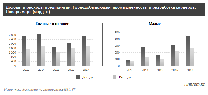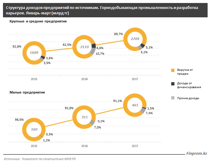 Крупные предприятия показали более существенный прирост доходов, чем малые. За январь-март этого года доходы крупных и средних сырьевиков составили 2,7 триллиона тенге, или на 598,9 миллиарда (+28%) больше, чем год назад.
