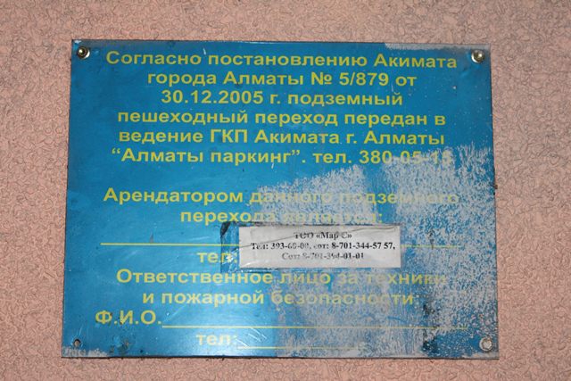 Никаких требований к правилам содержания подземных переходов, внешнему виду бутиков или ассортименту ни управление финансов (как собственник), ни ТОО «Алматы спецтехпаркинг сервис» (как управляющая компания), судя по всему, не предъявляют. Во многих из них тусклое освещение, асфальт в трещинах и ямах, узкие проходы, отсутствуют даже первичные средства пожаротушения и охранно-пожарная сигнализация. А семь переходов из 27, переданных в управление ТОО «Алматы спецтехпаркинг сервис», вообще находятся в таком состоянии, что туда небезопасно спускаться: темно, грязно, исписанные местами нецензурными словами стены, мусор и резкий фекальный запах.