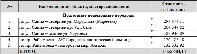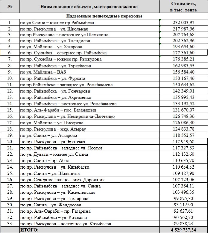 Меньше всего средств «ушло» на конструкцию по проспекту Рыскулова восточнее улицы Казыбаева, его стоимость, как видно из таблицы, составила чуть более 89,8 млн тенге.