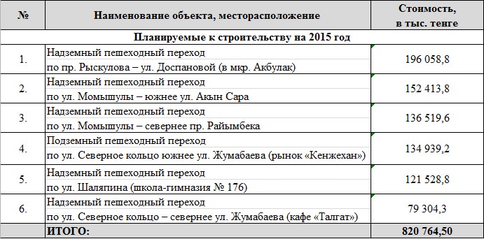 В 2015-м также планируется начать строительство шести пешеходных переходов. И снова все это обойдется в копеечку местному бюджету – в 820 млн 764 тыс. 500 тенге.