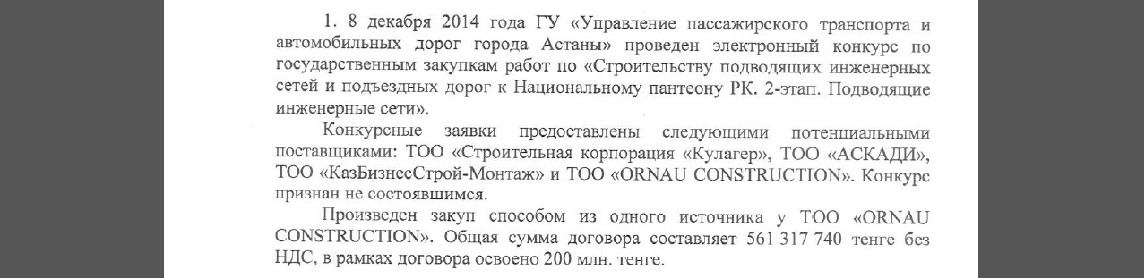 Впервые о том, что строительство национальной усыпальницы будет финансироваться из госказны, казахстанцы узнали в октябре 2014-го. Тогда правительство приняло решение о выделении 1 млрд тенге для строительства подводящих инженерных сетей и подъездных дорог. Спустя три года министр финансов Бахыт Султанов сообщил журналистам: из бюджета 2017 года будет направлено еще 1,7 млрд тенге. Однако акимат Астаны настаивает, что на сегодня на строительство подводящих инженерных сетей истрачено всего 200 млн тенге. Общая сумма договора с подрядчиком ТОО «ORNAU CONSTRUCTION» составляет более 561 млн тенге. Стоит отметить, что электронный конкурс по этому лоту завершился закупом из одного источника.