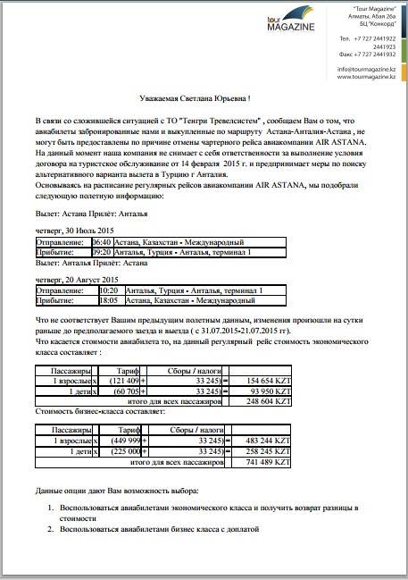 - Предложила ей два варианта выхода из ситуации. Первый - вылет на регулярных рейсах эконом-классом с соответствующим возвратом разницы. Второй - бизнес-класс с доплатой… На что получила ответ, что ее не волнует, как я это сделаю, но билеты должны быть AirAstana и бизнес-класс.
