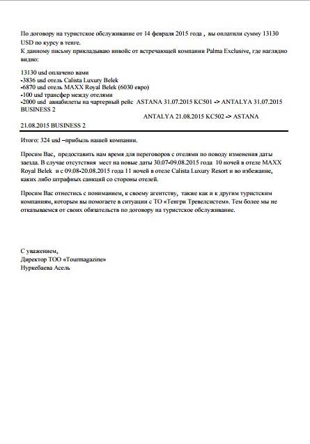Весной 2015 года депутат купила тур в Турцию: «Приняв оплату у Романовской я, как и положено, выдала соответствующие документы. Приходный кассовый ордер и фискальный чек. Забронировав авиабилеты через компанию Travelsystem в бизнес-класс на чартерном рейсе авиакомпании AirAstana, я с уверенностью их оплатила и стала готовить документы к выдаче. Как известно, 3 июня 2015 года оператор Travelsystem объявил о своей несостоятельности, и я оказалась в числе пострадавших, при этом ценой невероятных усилий мне удалось вернуть средства, заплаченные за билет в размере 2000 долларов. Это стоимость перелета в бизнес-классе», - говорит предприниматель.