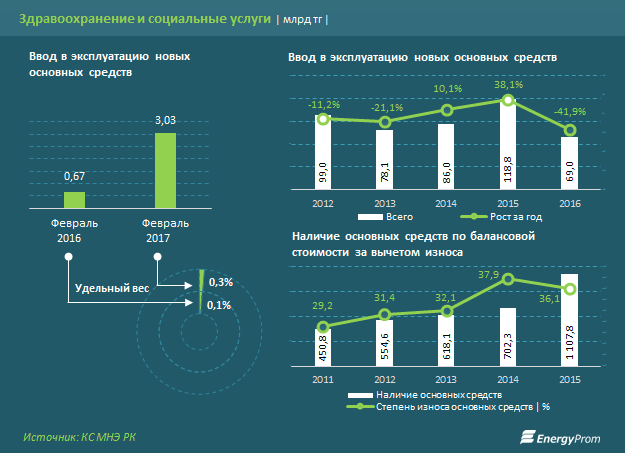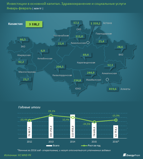 Инвестиции в основной капитал в системе здравоохранения и социальных услуг за 2 месяца составили 3,3 миллиарда тенге. Из них почти две трети пришлись на Алматы и Астану, где сосредоточены основные общереспубликанские медицинские институты.